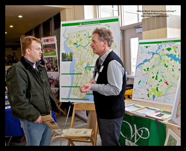 Expo, l. Attendee r. David Emerson Director of Stewardship, Westchester Land Trust. Bedford 2020, Environmental Action Day, Fox Lane High School, Bedford, New York. ©Mardi Welch Dickinson/KymryGroupTM All Rights Reserved.