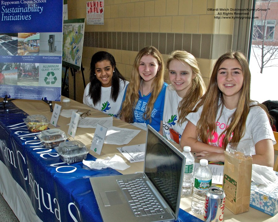 Expo, Rippowam Cisqua School Students Volunteers. l to r. Dominique Moise, Arianna Gelwicks, Clara Seaborn & Emma Boyd. Bedford 2020, Environmental Action Day, Fox Lane High School, Bedford, New York. ©Mardi Welch Dickinson/Kymry GroupTM All Rights Reserved.