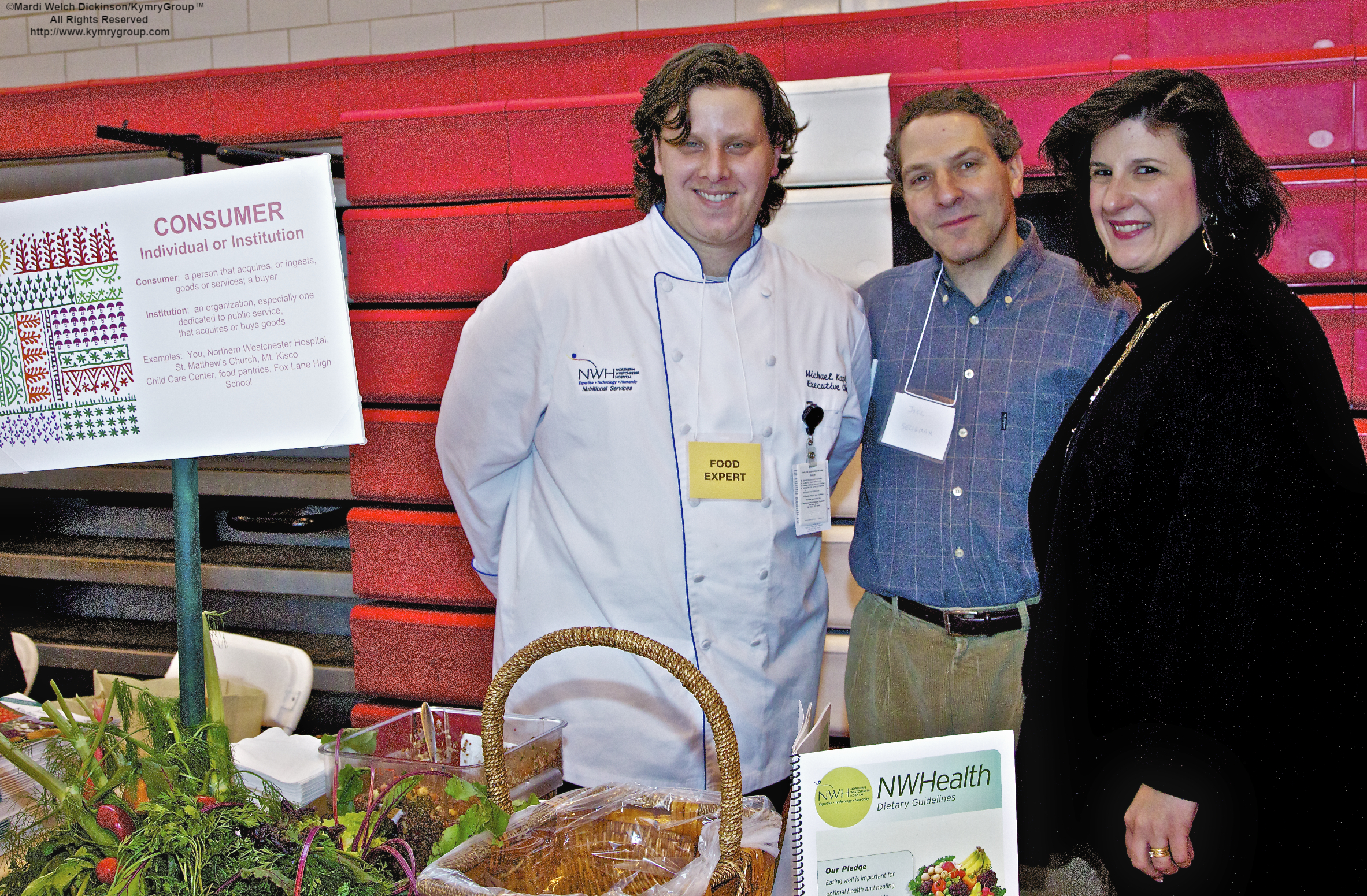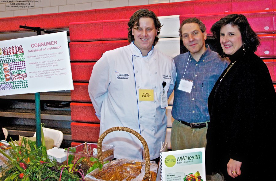Expo, l. to r. Michael Kaplan, NWH Executive Chef, Joel Seligman, President & CEO of Northern Westchester Hospital, Maria Hale V/P of Patient Advocacy Nothern Westchester Hospital. Bedford 2020, Environmental Action Day, Fox Lane High School, Bedford, New York. ©Mardi Welch Dickinson/Kymry GroupTM All Rights Reserved.