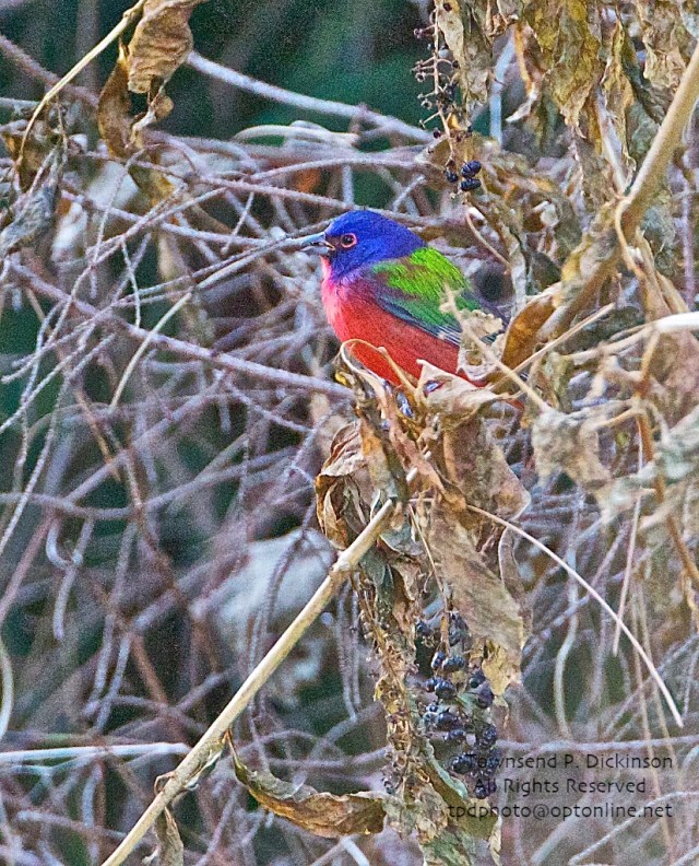 Painted Bunting, Cove Island Wildlife Sanctuary, Cove Island Park, Stamford CT, Novemeber 25, 2011. ©Townsend P. Dickinson. All Rights Reserved. http://www.kymrygroup.com