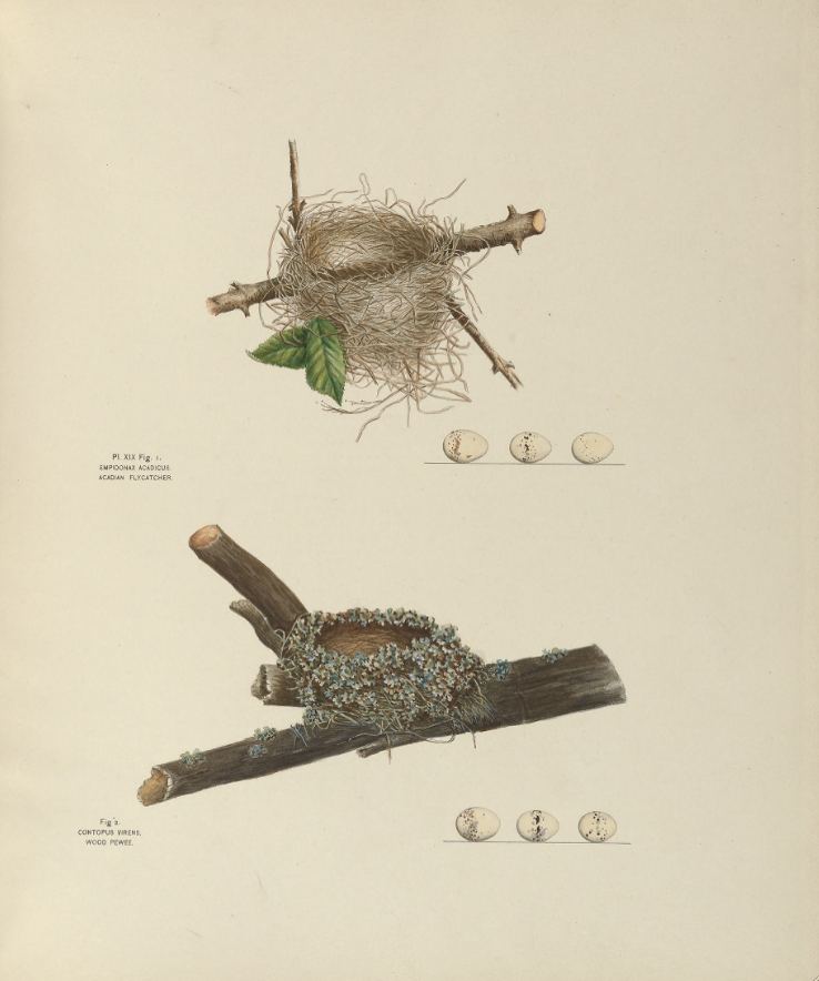 Fig 1. Arcadian Flycatcher. Fig 2. Wood Peewee. Illustrations by Eliza Schiltz of Nests and Eggs of Birds of Ohio. Courtesy of the Smithsonian Institution Libraries, Washington DC. Nests, Eggs, Heartbreak & Beauty exhibition, opening reception and book signing, Museum of American Bird Art at Mass Audubon on September 29, 2012.