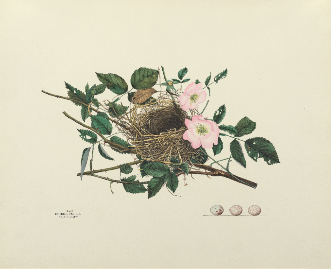 Field-Sparrow Spizella Pusilla Nest Illustrated by Virginia Jones of Nests and Eggs of Birds of Ohio. Courtesy of the Smithsonian Institution Libraries, Washington DC. Nests, Eggs, Heartbreak & Beauty exhibition, opening reception and book signing, Museum of American Bird Art at Mass Audubon.