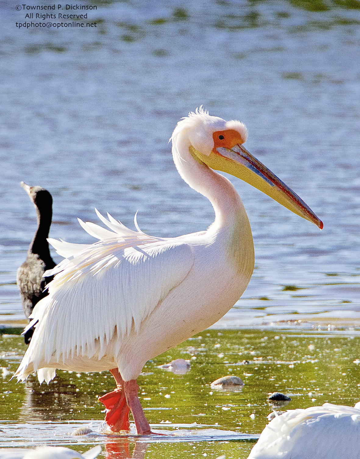 Great White Pelican, (probable female in breeding plumage), extralimital, roosting with American Pelicans, Ding Darling NWR, Sanibel Island, Florida. ©Townsend P. Dickinson All Rights Reserved. Photo may not be used without written permission.