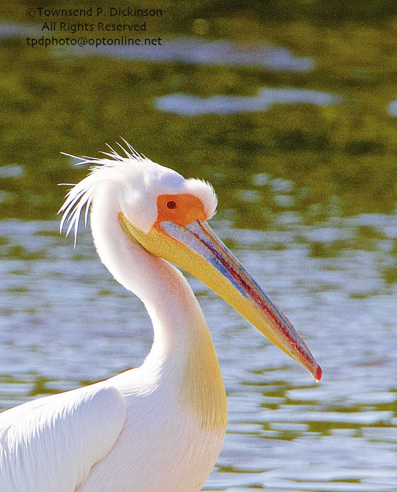 Great White Pelican, (probable female in breeding plumage), extralimital, with American Pelicans, Ding Darling NWR, Sanibel Island, Florida. ©Townsend P. Dickinson. All Rights Reserved. Photo may not be used without written permission.