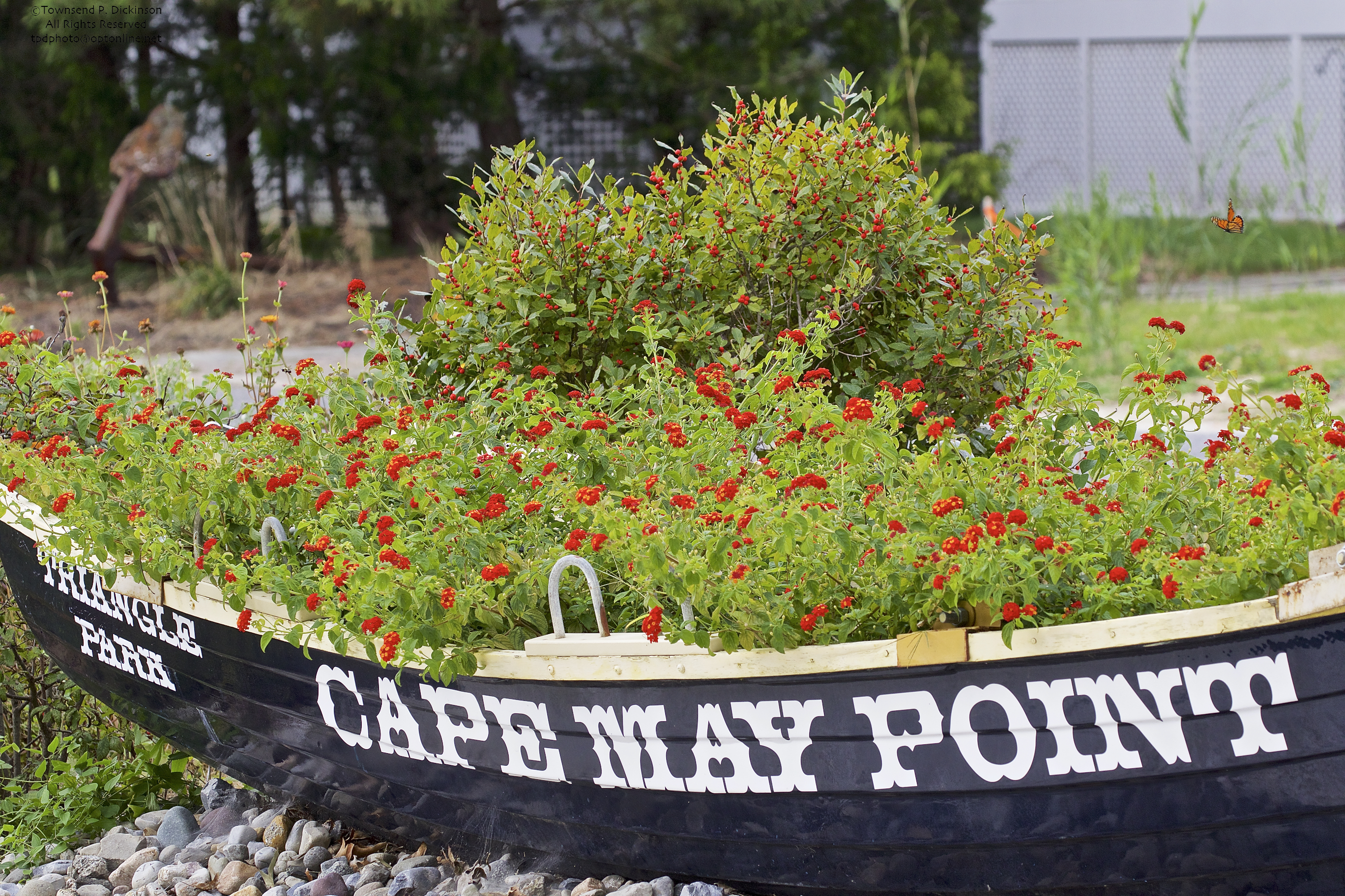 Triangle Park, retired life guard saving boat as planter, with Monarch in flight, site of Monarch Butterfly banding stations, West Cape May, NJ. ©Townsend P. Dickinson. All Rights Reserved.