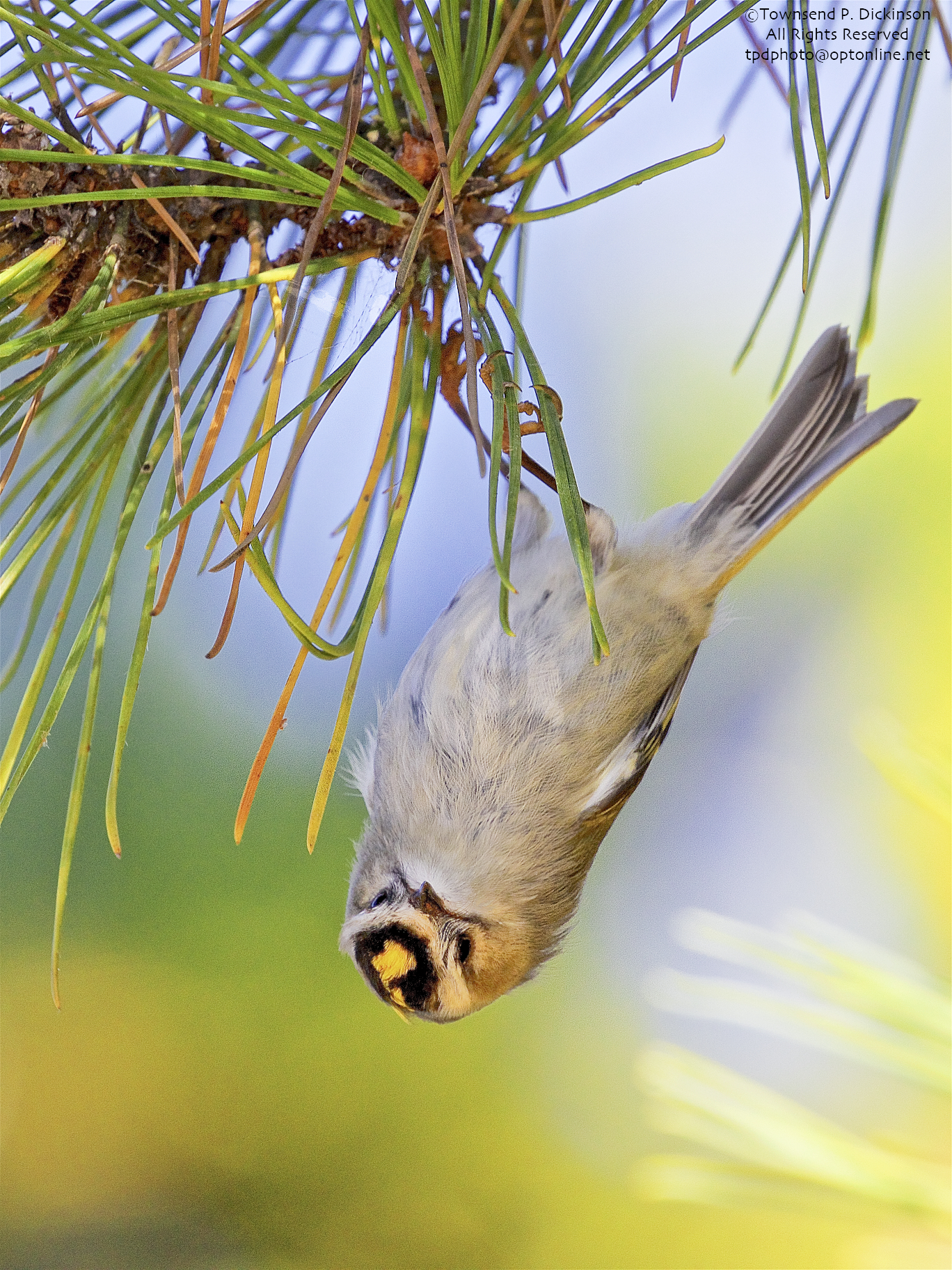 Golden-crowned Kinglet, fall migrant, foraging in Pine near Cape May Hawk Watch Platform, Cape May State Park, West Cape May, NJ.©Townsend P. Dickinson.