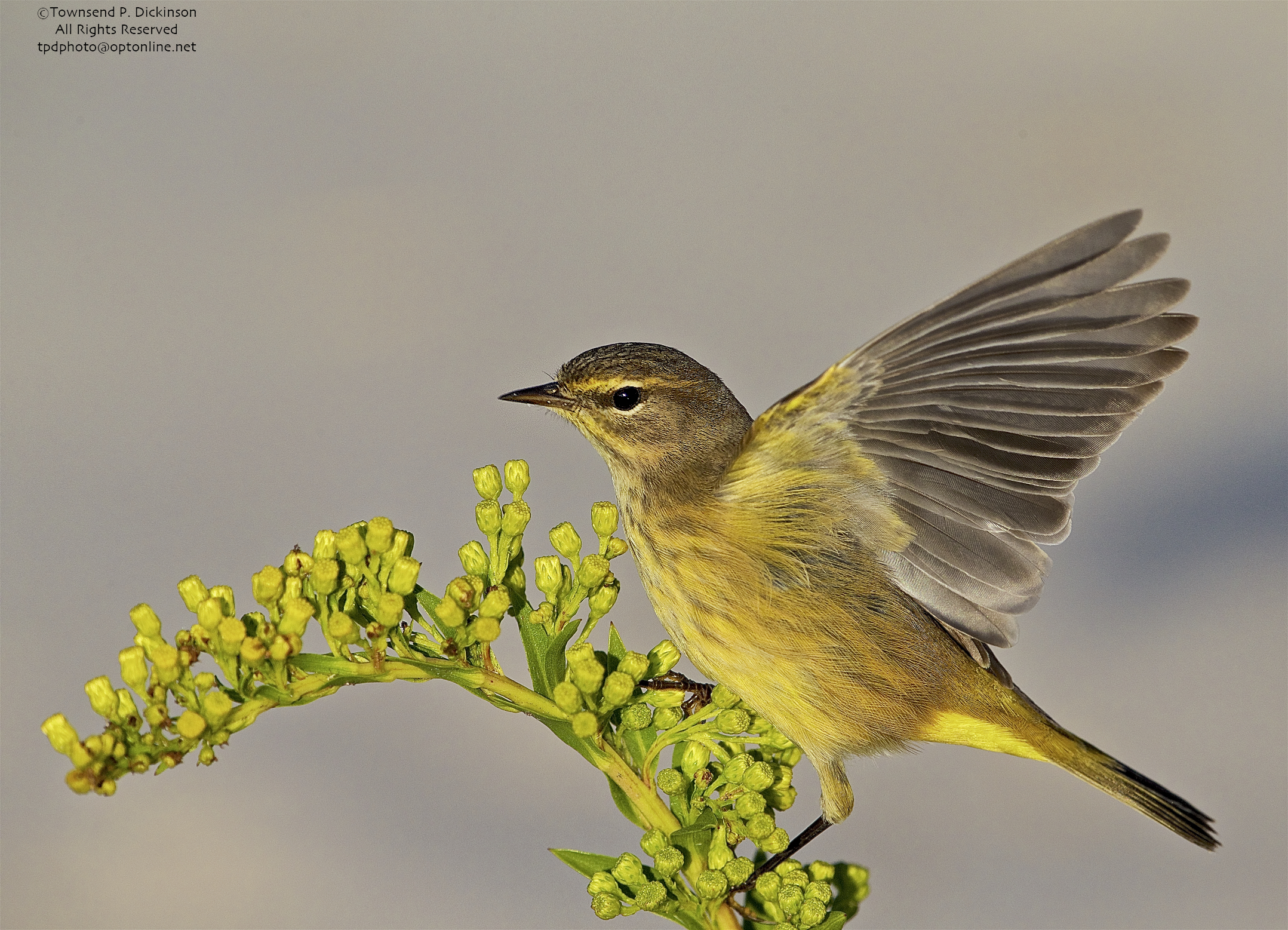 Palm Warbler, fall migrant, foraging on sand beach with goldenrod, Cape May Point, Cape May, NJ. ©Townsend P. Dickinson.