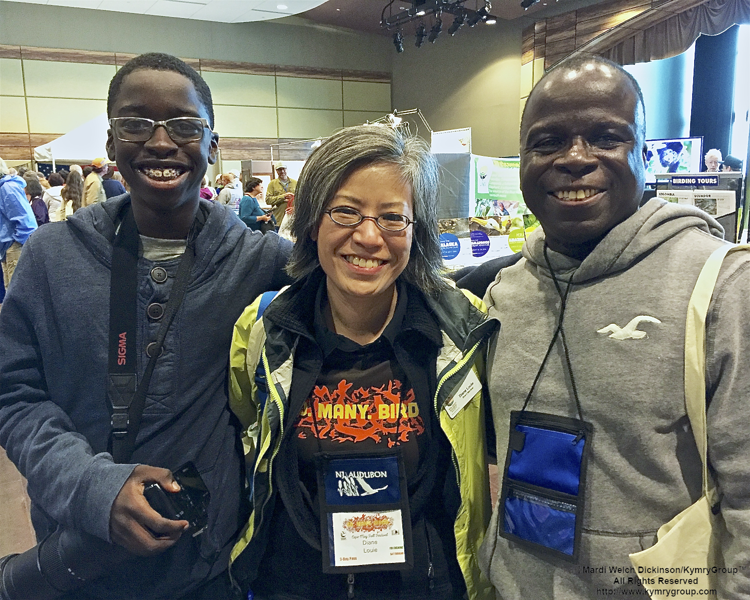 L. to R. Kojo Baidoo, Young Birder; Diane Louie, NJ Audubon Board Member; Kwamena Baidoo. Enjoying Cape May Fall Festival & Trade Show, Convention Hall, Cape May NJ. ©Mardi Welch Dickinson All Rights Reserved.